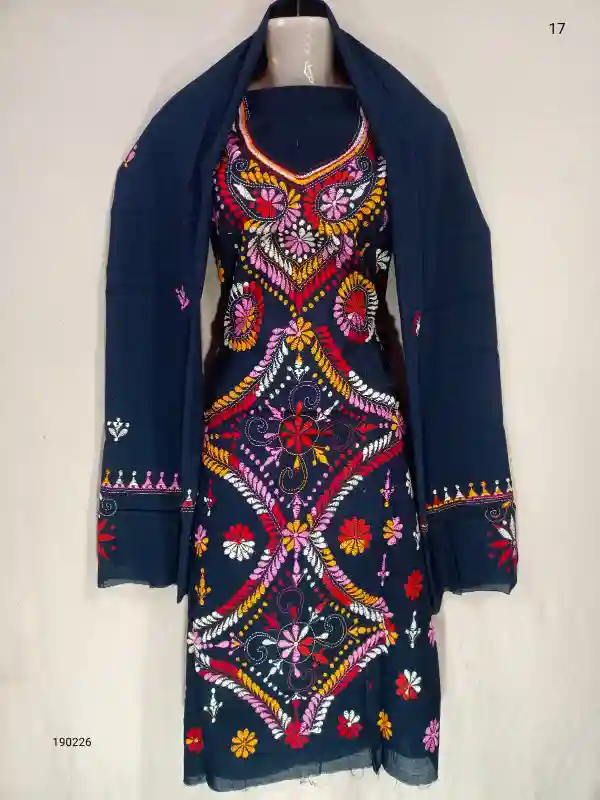 Buy Pure Cotton Dress Materials with hand woven Embroidery. Bengal has an old tradition of Kantha embroidery. Shop for Kantha Stitched Salwar Suit including upper bottom and dupatta. Shop for exclusive collection of Salwar. Kantha Stitched design is unique in design. Cash on Delivery Available all over India. Additional discount on Prepaid Order.