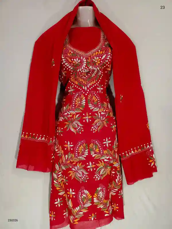 Buy Pure Cotton Dress Materials with hand woven Embroidery. Bengal has an old tradition of Kantha embroidery. Shop for Kantha Stitched Salwar Suit including upper bottom and dupatta. Shop for exclusive collection of Salwar. Kantha Stitched design is unique in design. Cash on Delivery Available all over India. Additional discount on Prepaid Order.